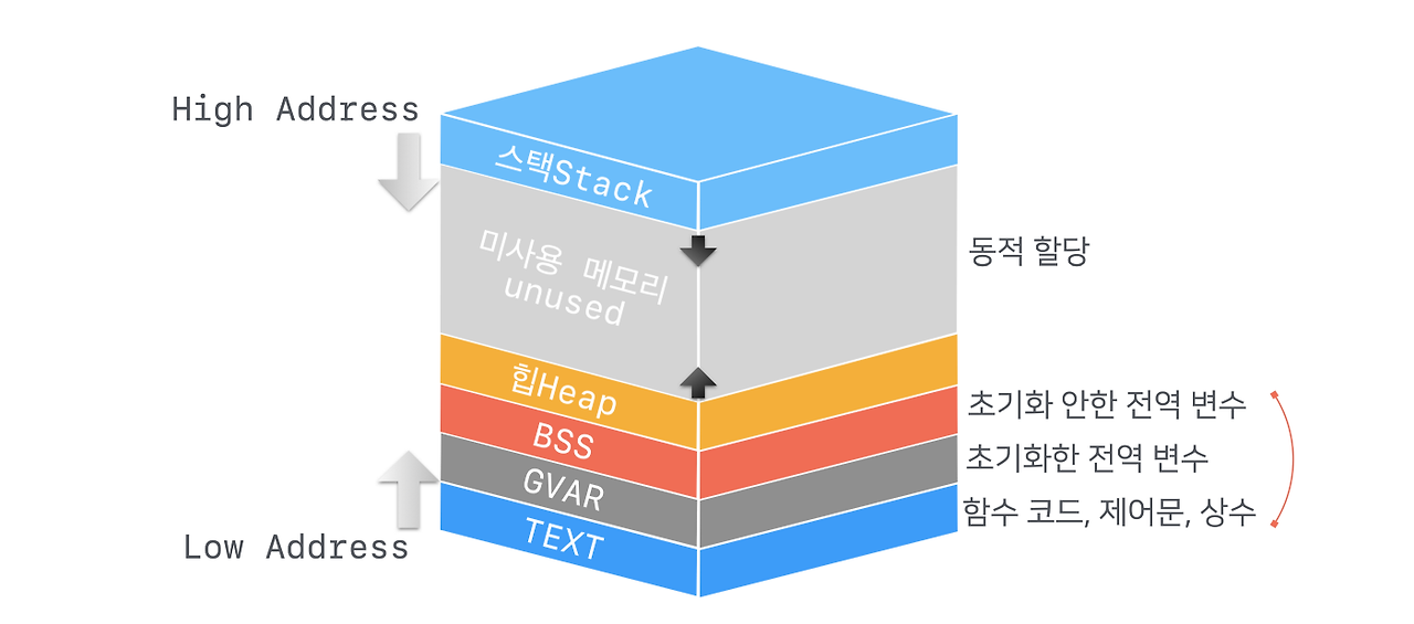 헷갈리지 말아야 할 부분은 Stack 과 Heap은 같은 메모리를 공유한다는 점입니다.